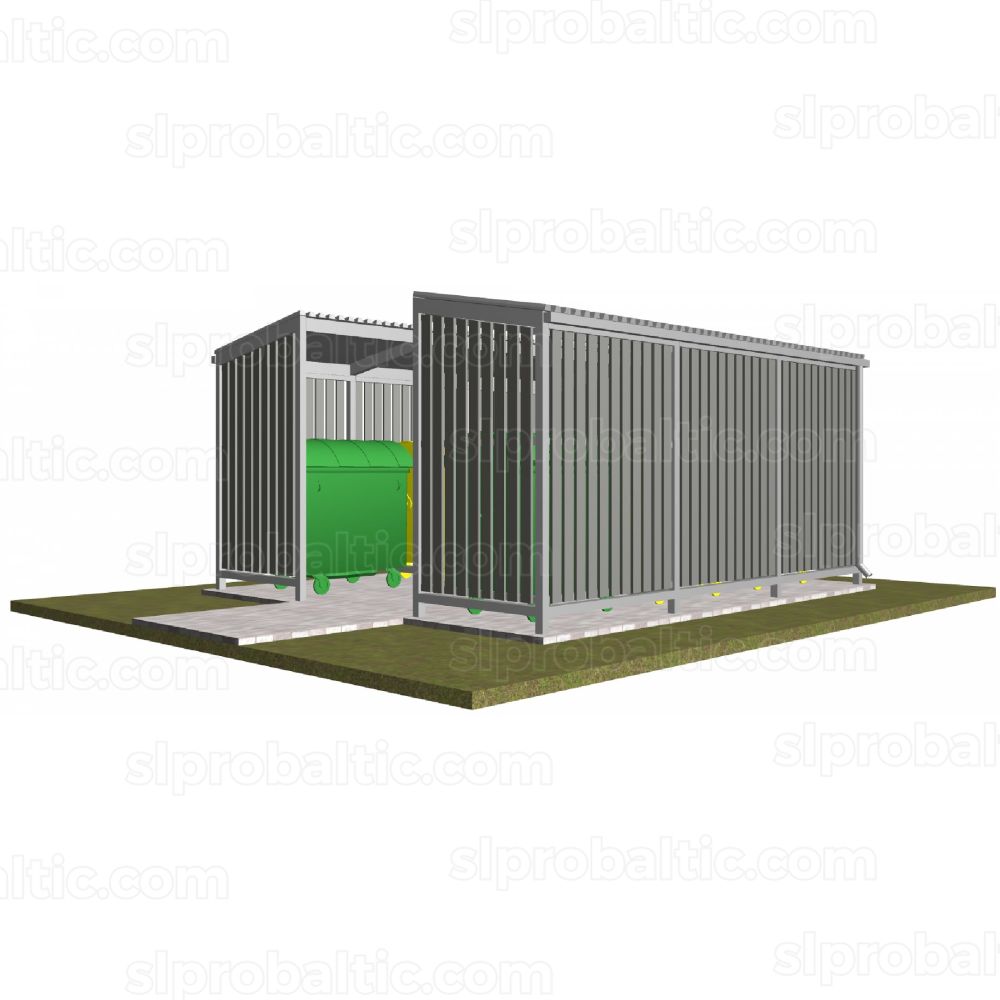 Standarta atkritumu konteineru novietņu risinājumus bez durvīm. Novietne paredzēta sešiem lieliem konteineriem, pa trīm katrā pusē.