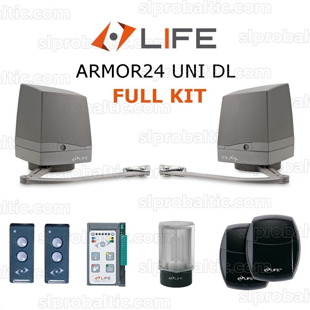 Komplektācija: divi motori, vadības plate, signāllampa LIFE SPL24, fotoelementu pāris LIFE VISIO, divas tālvadības pultis LIFE DREAM.