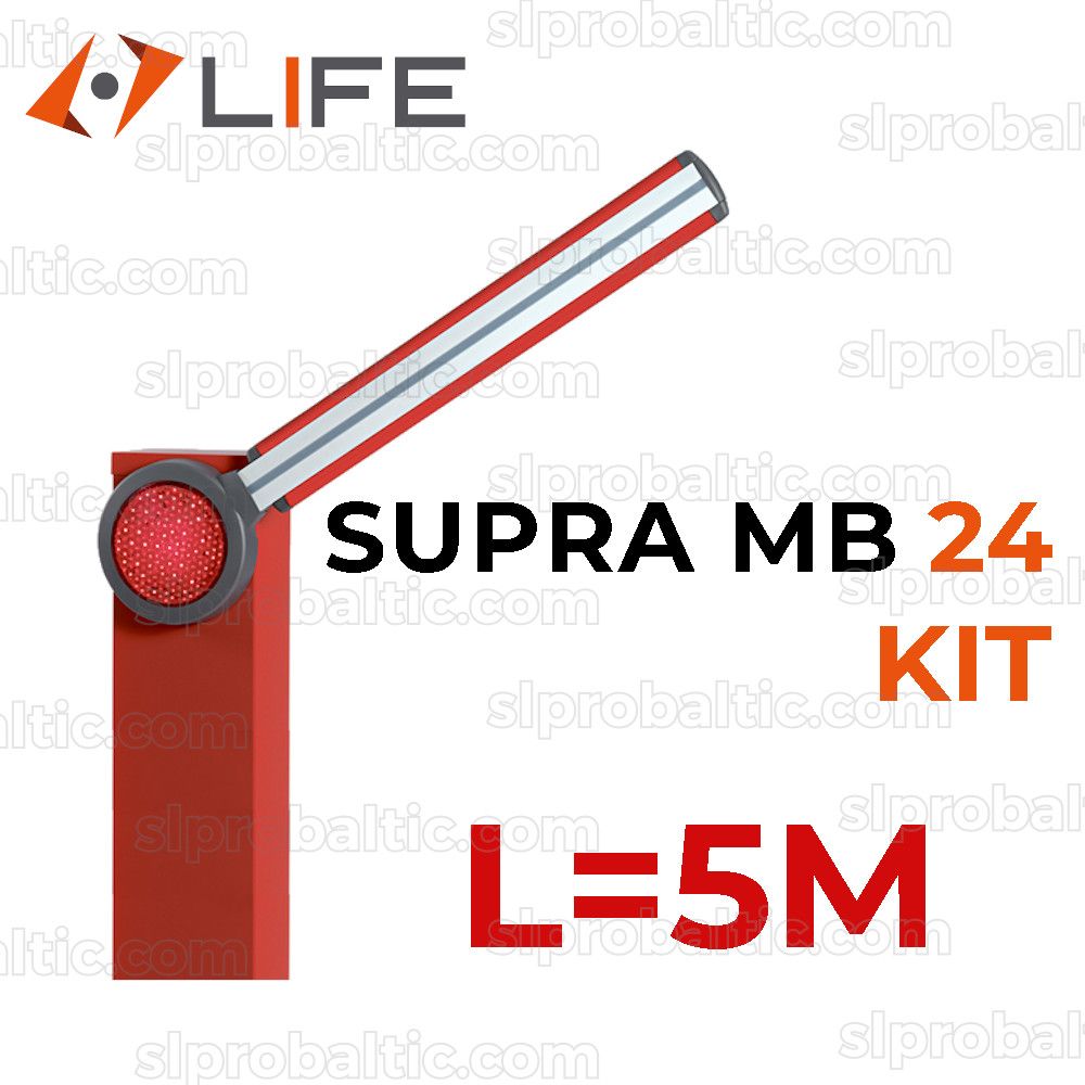Komplektācija: LIFE SUPRA MB 24 barjeras mehānisms, strēle, gumijas uzlikas uz strēles, atspere, vadības plate ar radiouztvērēju pults programmēšanai.