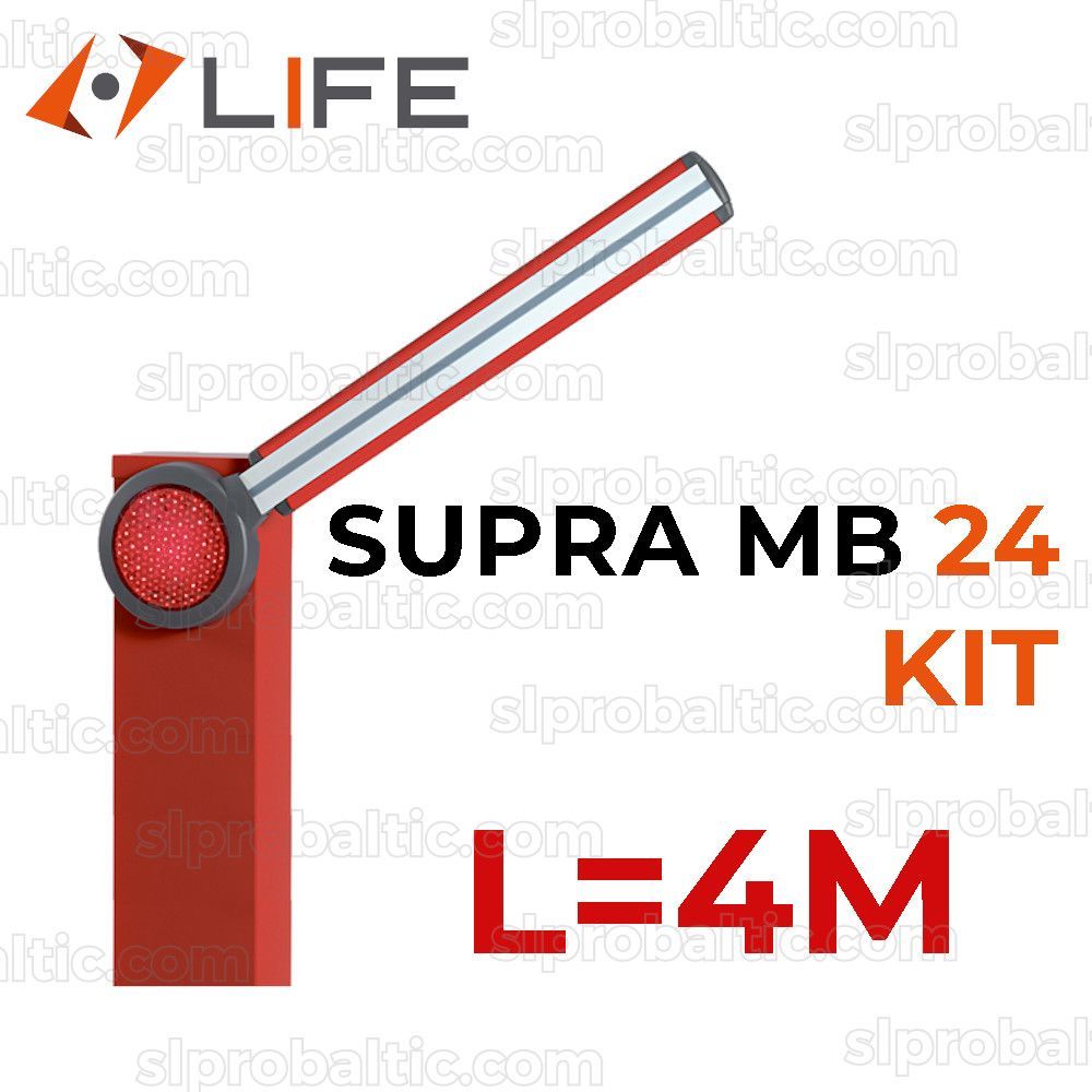 Komplektācija: LIFE SUPRA MB 24 barjeras mehānisms, strēle, gumijas uzlikas uz strēles, atspere, vadības plate ar radiouztvērēju pults programmēšanai.