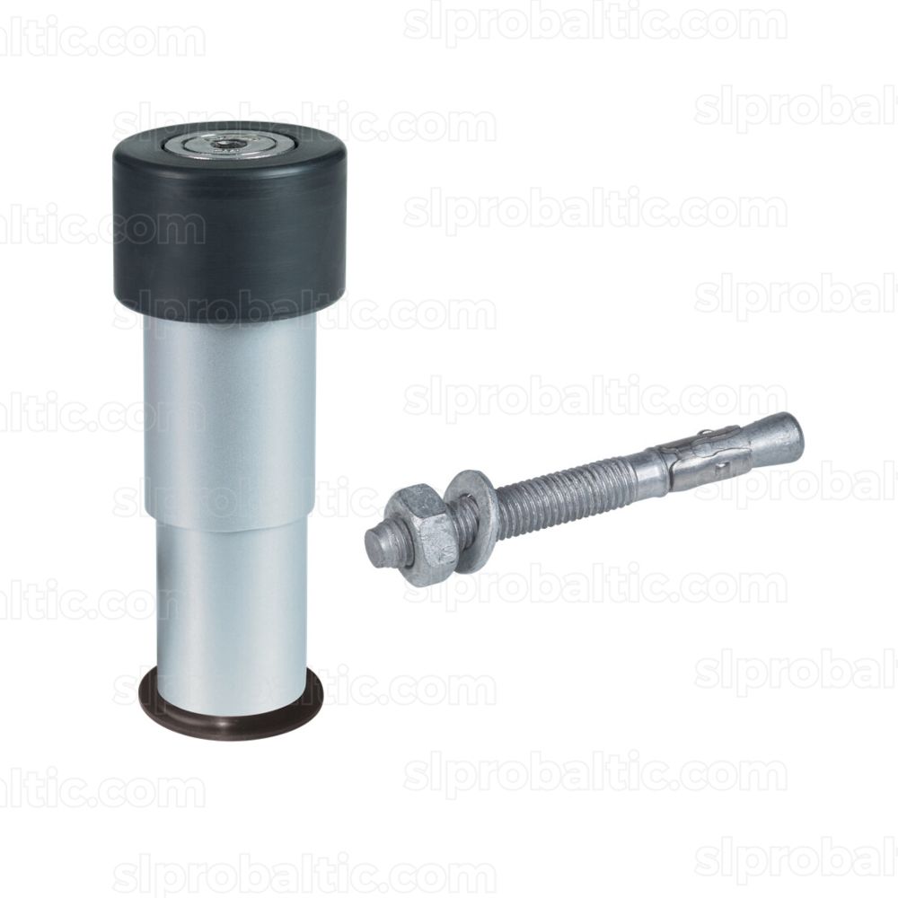 Alumīnija vārtu atdure. Gumijas aizturis novērš vārtu bojājumus. Augstums regulējams no 100 mm līdz 140 mm. Var izmantot arī kā sienas aizturi. Komplektā ietilpst enkura skrūve.